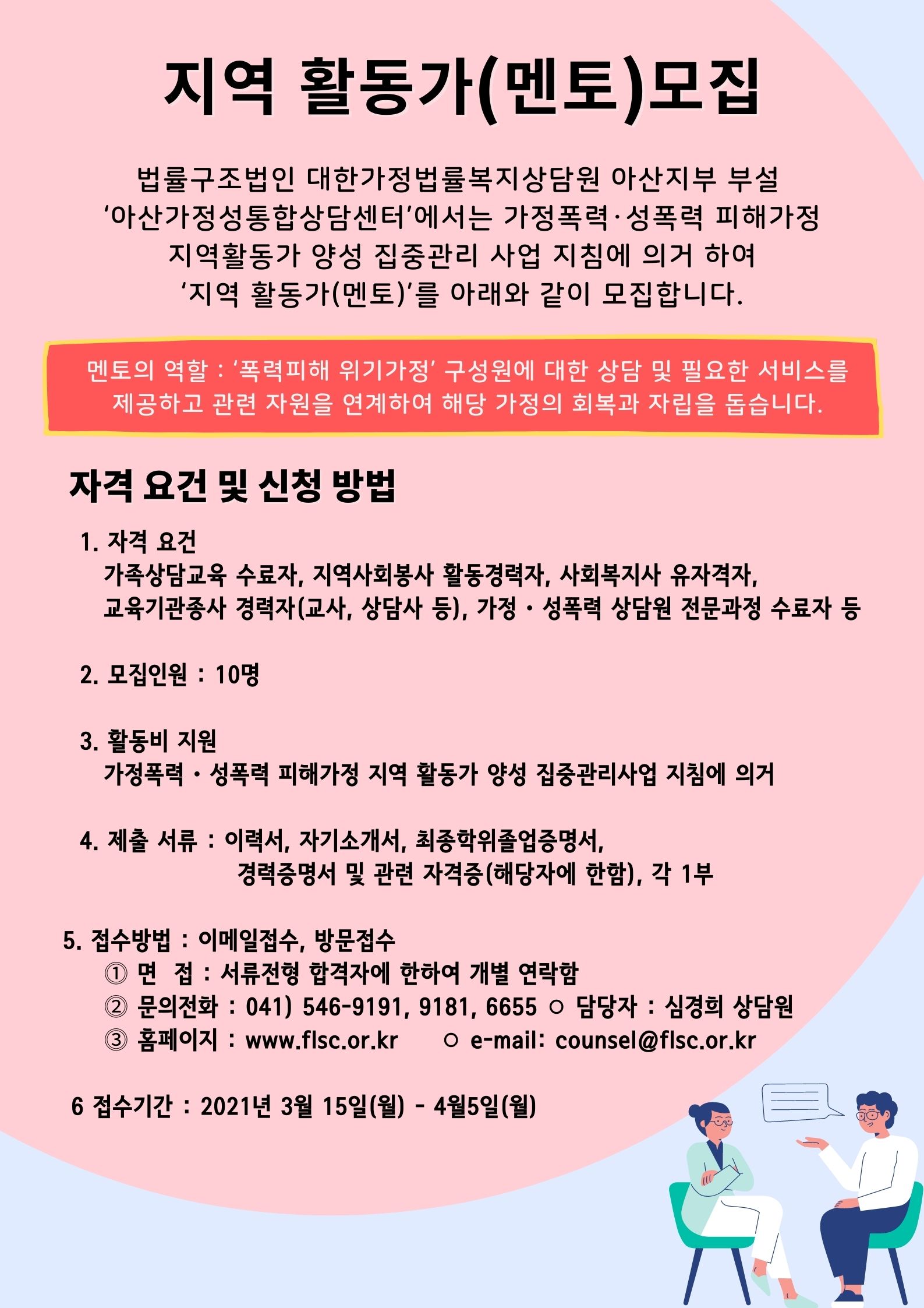 법률구조법인 대한가정법률복지상담원 아산지부 부설 ‘아산가정성통합상담센터’에서는 가정폭력・성폭력 피해가정 지역활동가 양성 집중관리 사업 지침에 의거 하여 ‘지역 활동가(멘토)’를 아래와 같이 모집합니다.