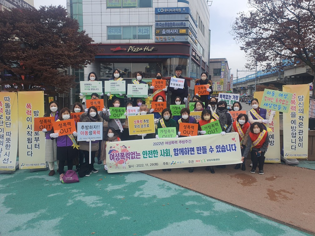 여성폭력추방주간을 (1125~1210) 맞아 1129여성 폭력 없는 안전한 사회 모두 함께 하면 만들 수 있습니다.’라는 표어로 온양온천역에서 아산시가 주최하여 본 상담센터와 아산경찰서, 해뜰가족상담소, 장애인성폭력아산상담소,  충남여성인권센터