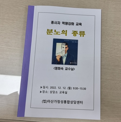 2022년 12월12일(월) 09:30~15:30 본 센터 집단 교육실에서 실시간화상교육으로 ‘분노의 종류’를 주제로 레마상담심리교육 연구소 명화숙 소장이 종사자 역량강화 교육을 실시하였다.