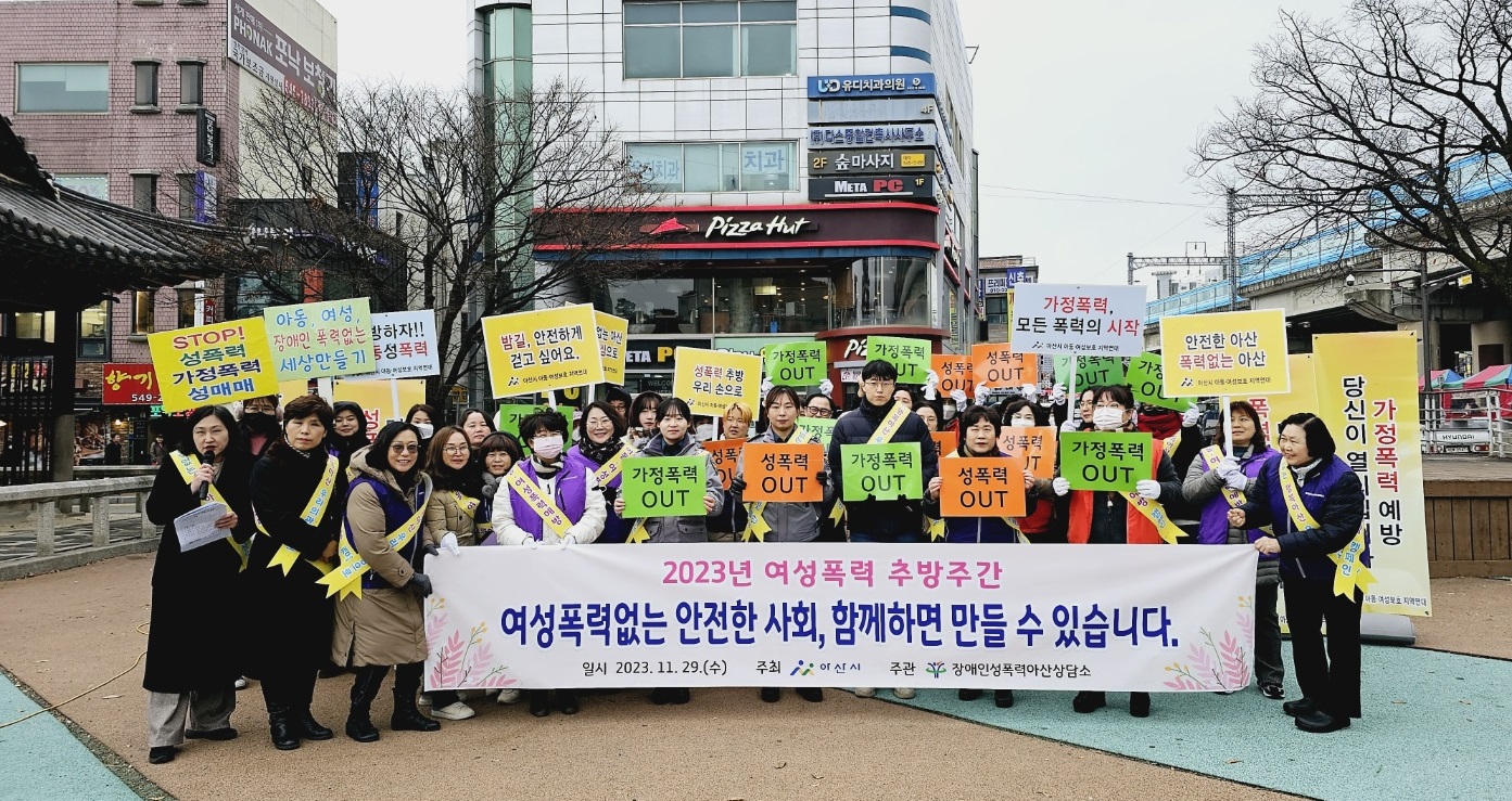 11월 29일(수) 오후 2시 온양온천역에서 여성폭력추방주간(11월 25일~12월 1일)을 맞이하여 ‘여성폭력없는 안전한 사회, 함께하면 만들 수 있습니다.’라는 슬로건을 가지고 본 기관(아산가정성통합상담센터)과 아산시청, 아산경찰서, 해뜰가족상담소, 장애인성폭력아산상담소, 아산늘품상담지원센터, 여성긴급전화1366충남센터 7개 기관이 모여 합동 캠페인을 전개했다.